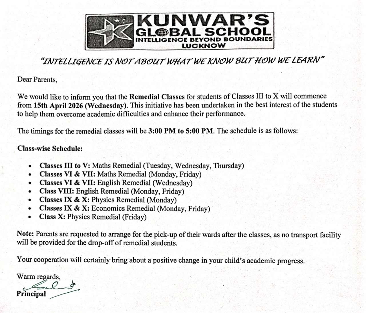 If you'd like your child to attend remedial classes for English and Maths, please confirm with the class teacher by tomorrow.